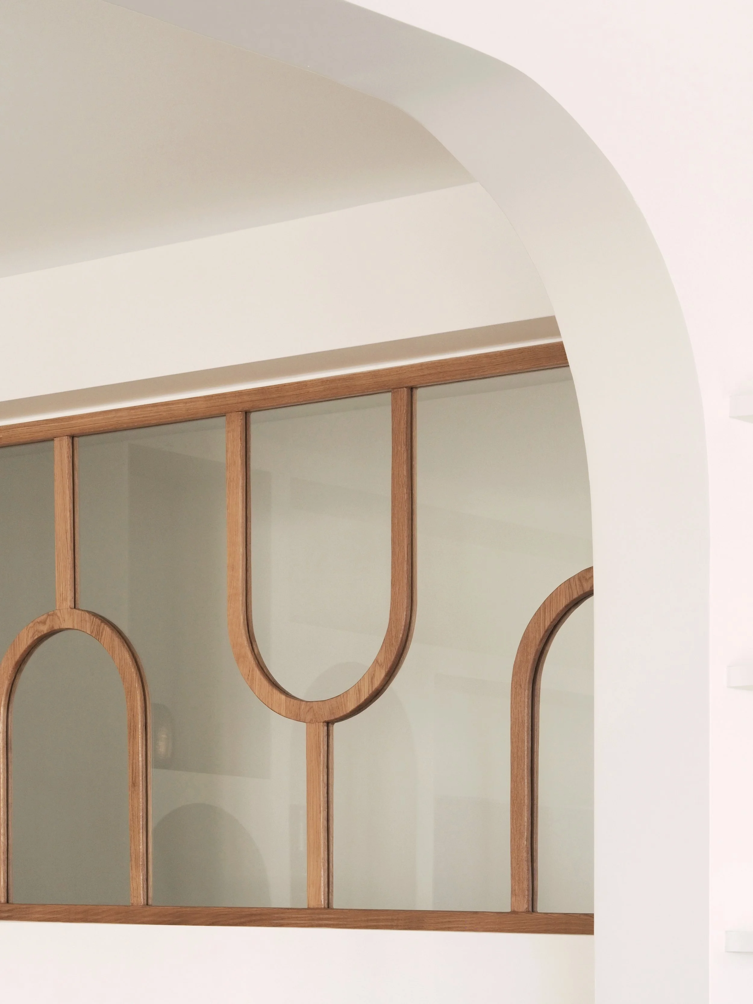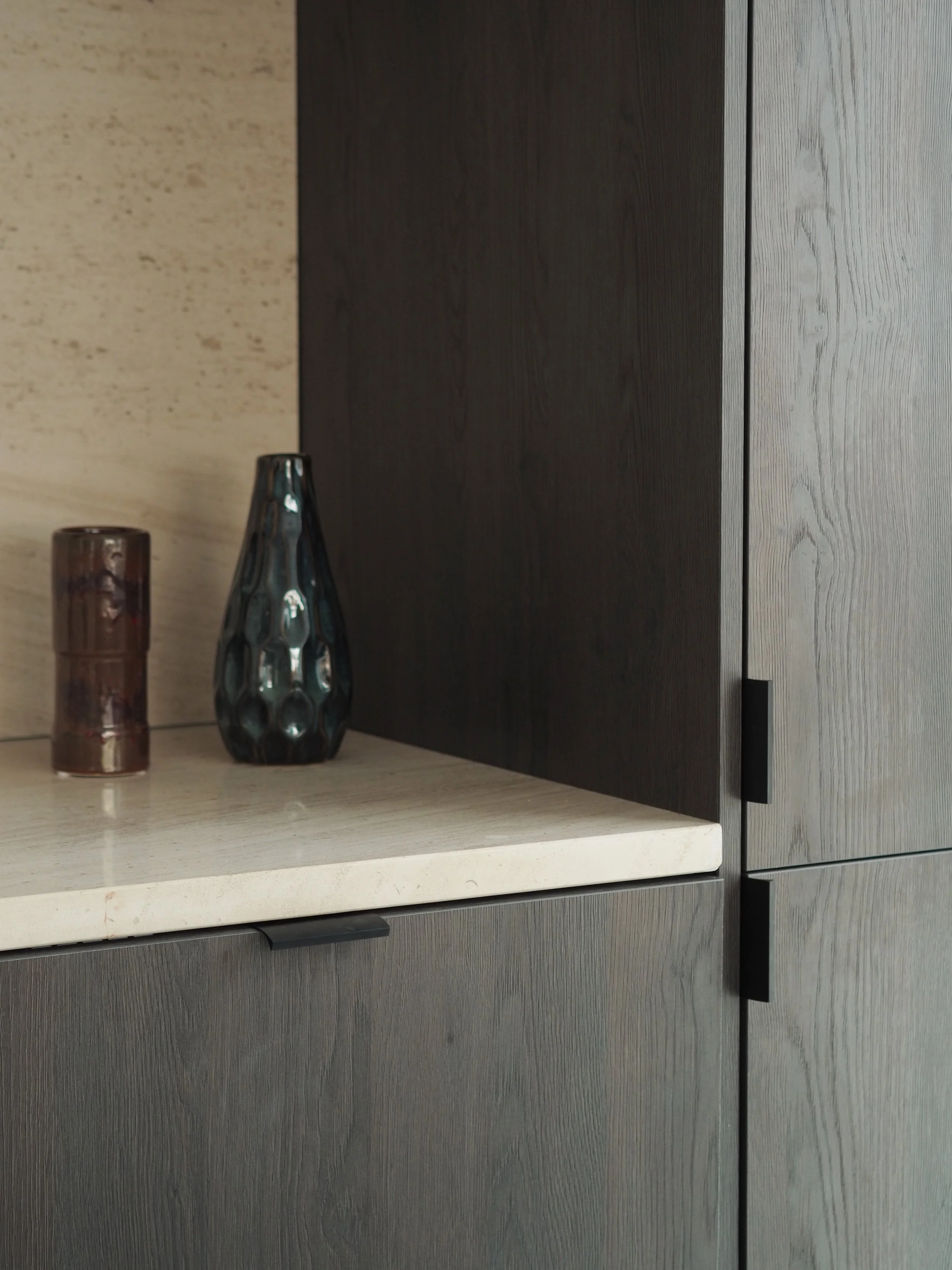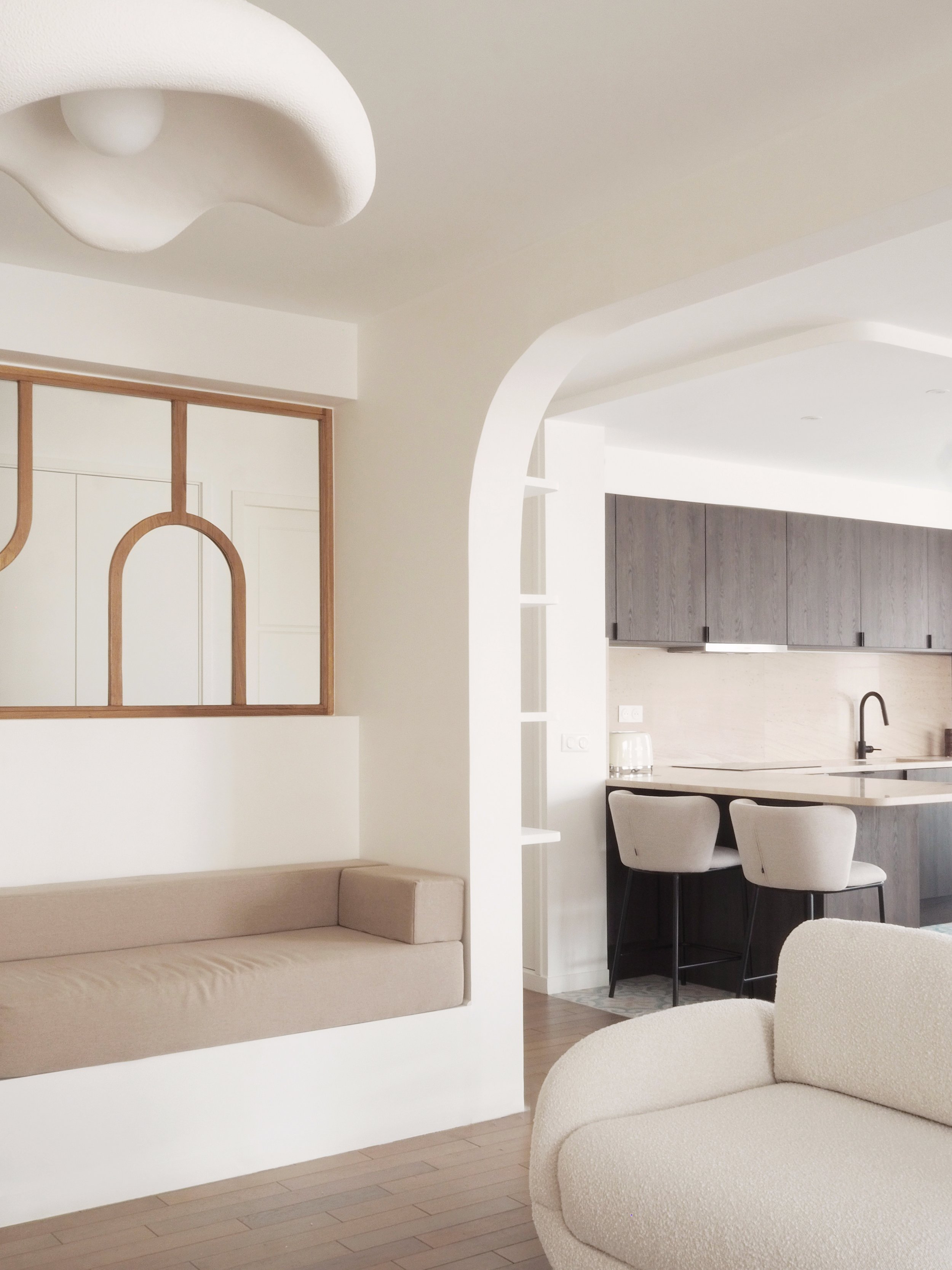 L’accent a été mis sur des interventions ciblées et sur mesure : une verrière a été installée entre l’entrée et le salon, apportant plus de clarté et une belle sensation d’ouverture dès l’arrivée. Une bibliothèque murale et une banquette en chêne massif viennent structurer l’entrée avec sobriété et chaleur.