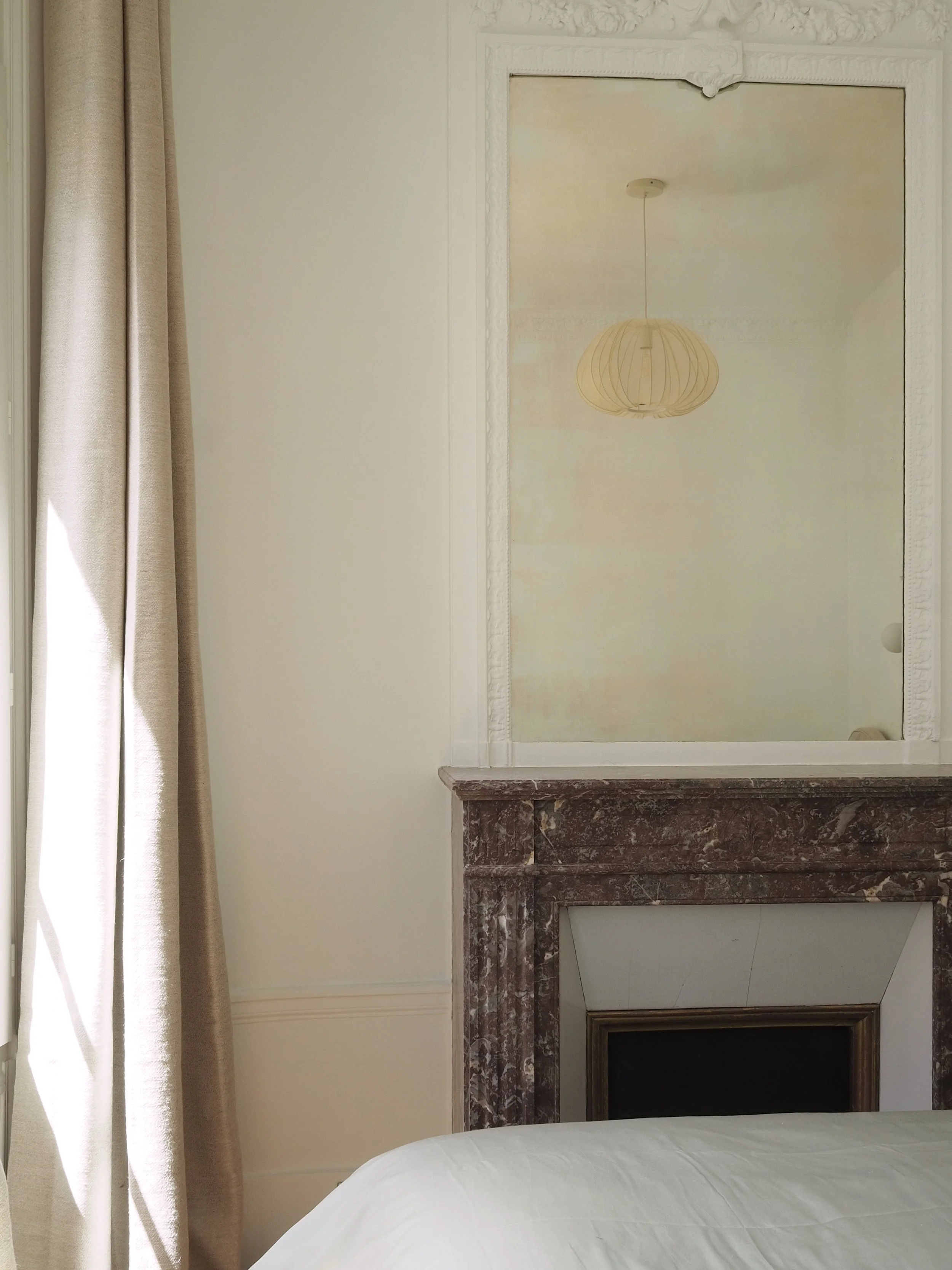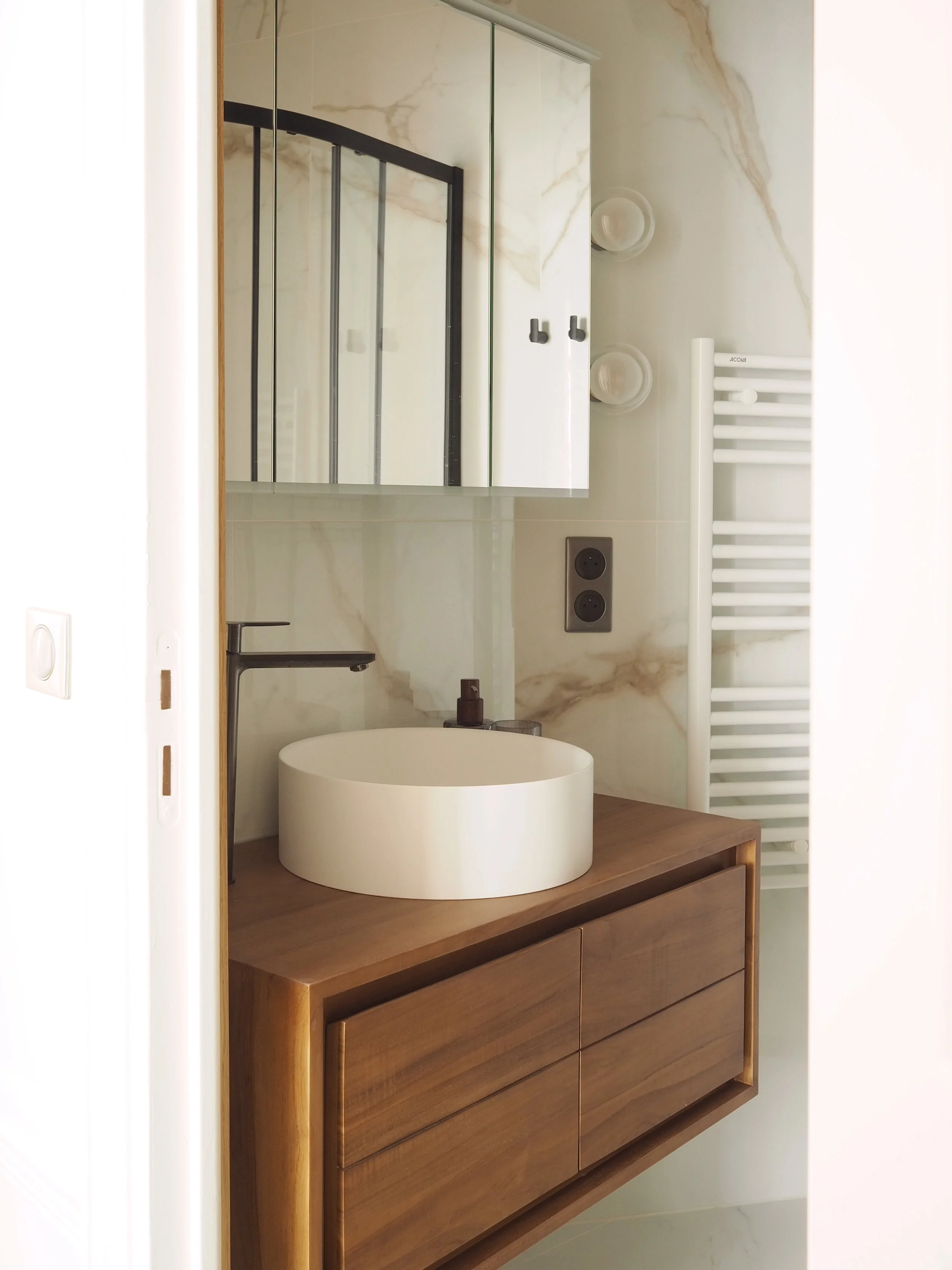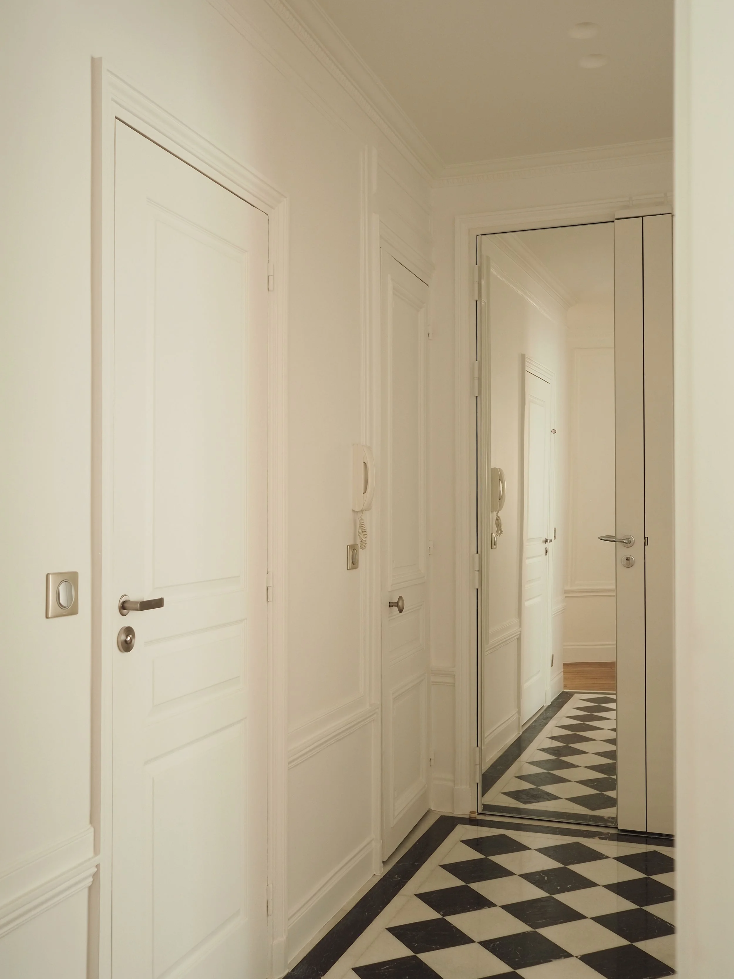 L’entrée s’habille d’un sol en damier de marbre noir et blanc, qui introduit d’emblée le contraste entre classicisme et minimalisme. Le salon, installé dans une rotonde, est enveloppé de voilages doux suspendus à un rail discret, créant une atmosphère apaisée et lumineuse.