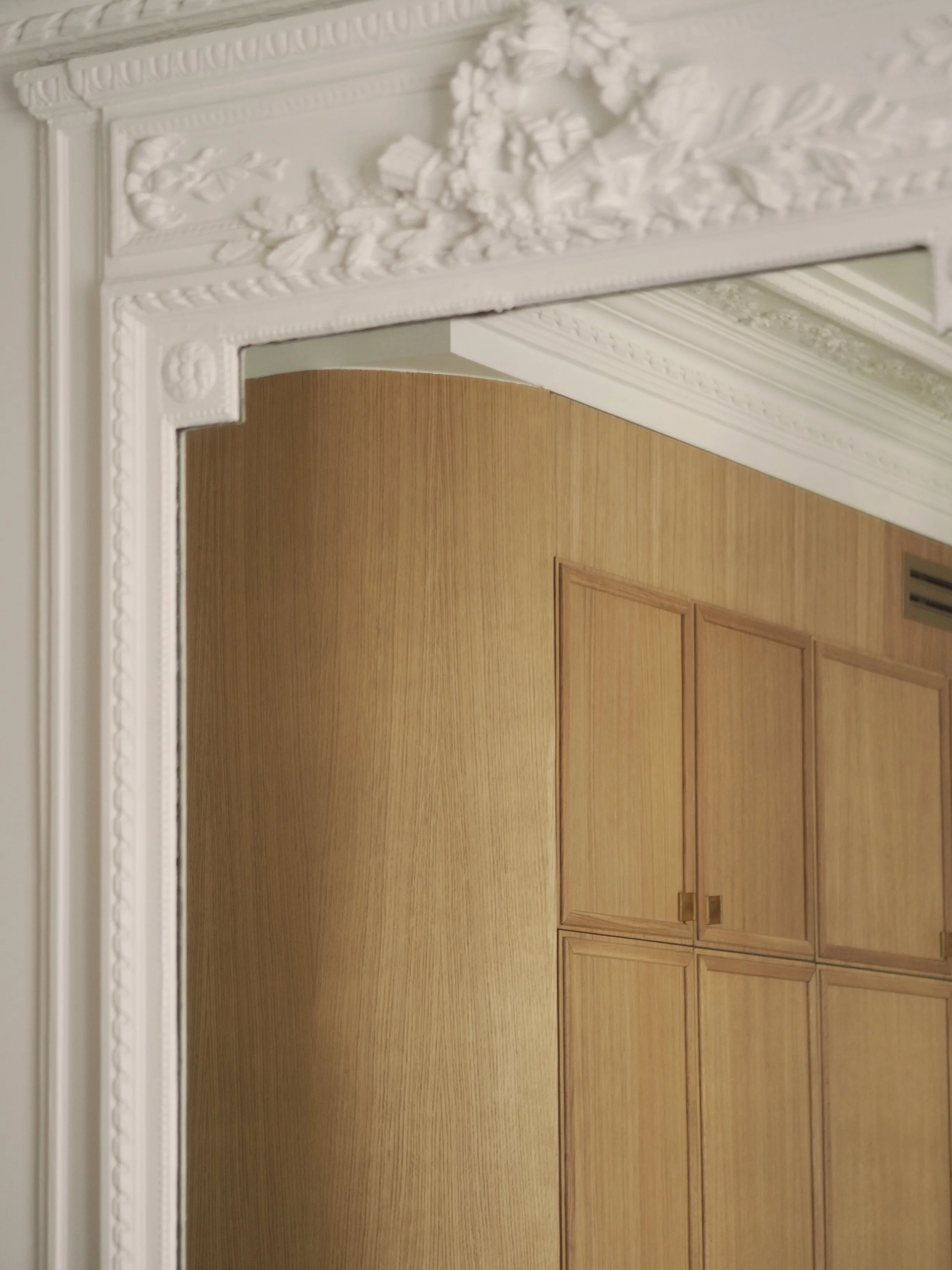 Le mobilier sur mesure, en chêne massif, a été pensé comme une continuité naturelle de l’architecture : tête de lit, dressings et buffets apportent chaleur et cohérence. Dans les pièces de vie, de grandes portes vitrées en fer forgé viennent structurer l’espace tout en laissant circuler la lumière.